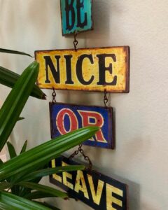 My husband thought this sign was too direct, demanding, too on the nose, so I camouflaged it behind an entry area plant. I didn’t get rid of it, I explained, because some invited guests let politics override their polite upbringing and were disturbing the peace of our home.