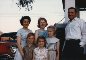 My sister recently shared this photo of our family, likely taken in the ’60s. I’m in the middle back, my hair still strawberry blonde and not yet lightened by the California sun. I recognize a dress I’d made, another in my favorite shade: blue.